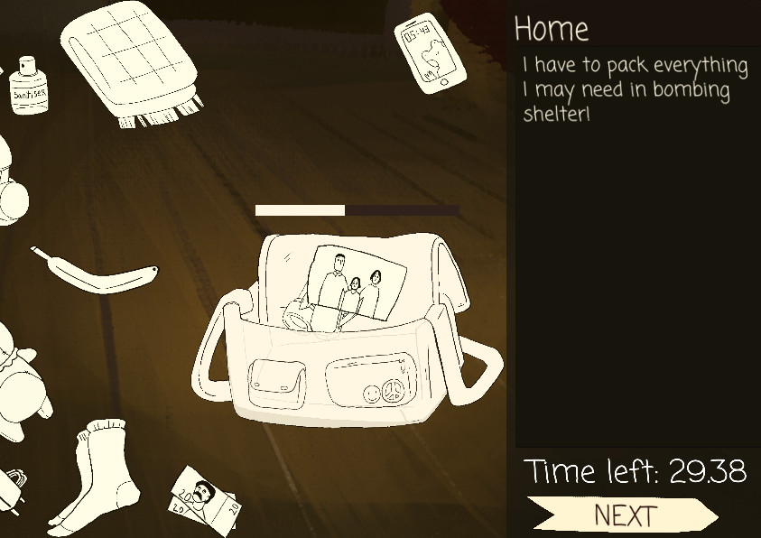 The game tells a story of a person who is caught in the siege of Mariupol. The player's main goal is to find perfect balance between objects' weight and usefulness. The player is facing hard choices between taking food and the photo of loved ones, blanket and the toy from childhood. While this game offers a fun element, the goal is to make players feel empathy to pals like they are that lived in Ukraine when that war started and experience how it changed their life.