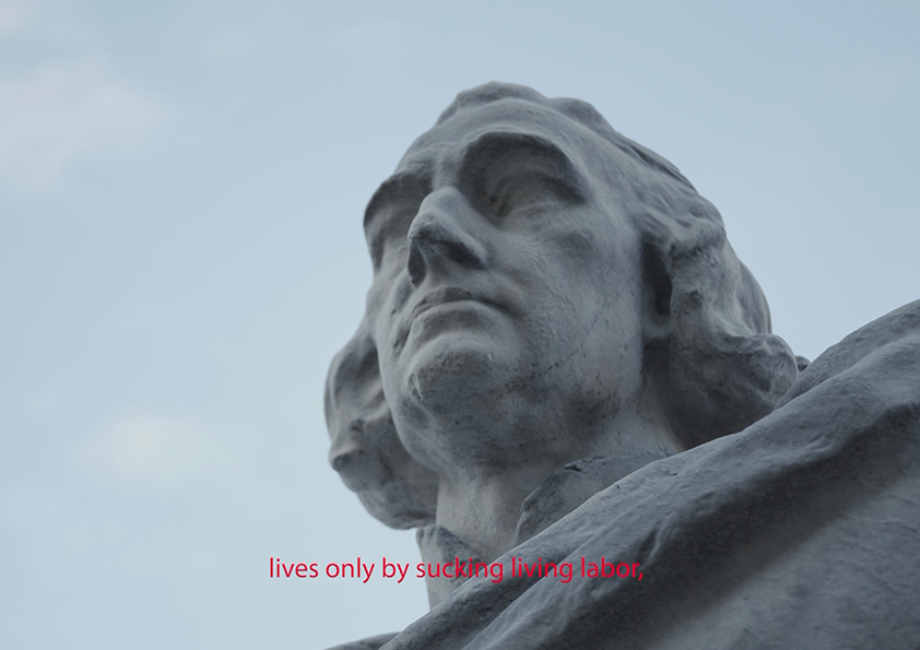 Kassel’s gps coordinates are the framework for the video: 51° 18’ 46.0836” North - 9° | 28’ 53.5584” East. The piece explores a collective passage from tram to tram stop; from the city outskirts to center, from the Wilhelmshöhe monument to the Nordstadt neighborhood. The video is a community's abstract itinerary and a migrant's metaphysical compass. It explores alternative histories of the city through text, color and sound. Bubbling mercurial waters speak to intimate archaeologies, immigration stories, and our collective desires: we anticipate a journey through a spectrum of colors while we imagine and create our futures.